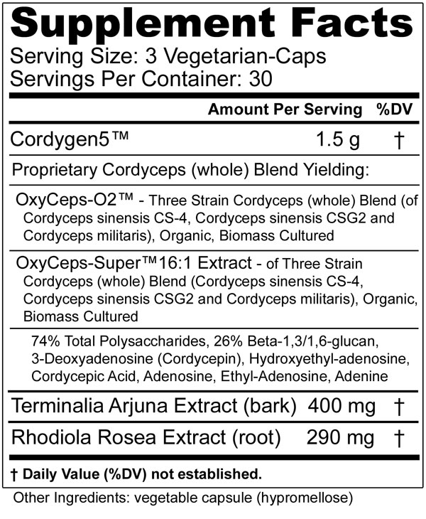 Trusted by professional endurance and strength athletes worldwide for nearly two decades, Cordygen5™combines two unique, three strain Cordyceps blends (one full spectrum & one extract) with extracts of Terminalia Arjuna and Rhodiola.